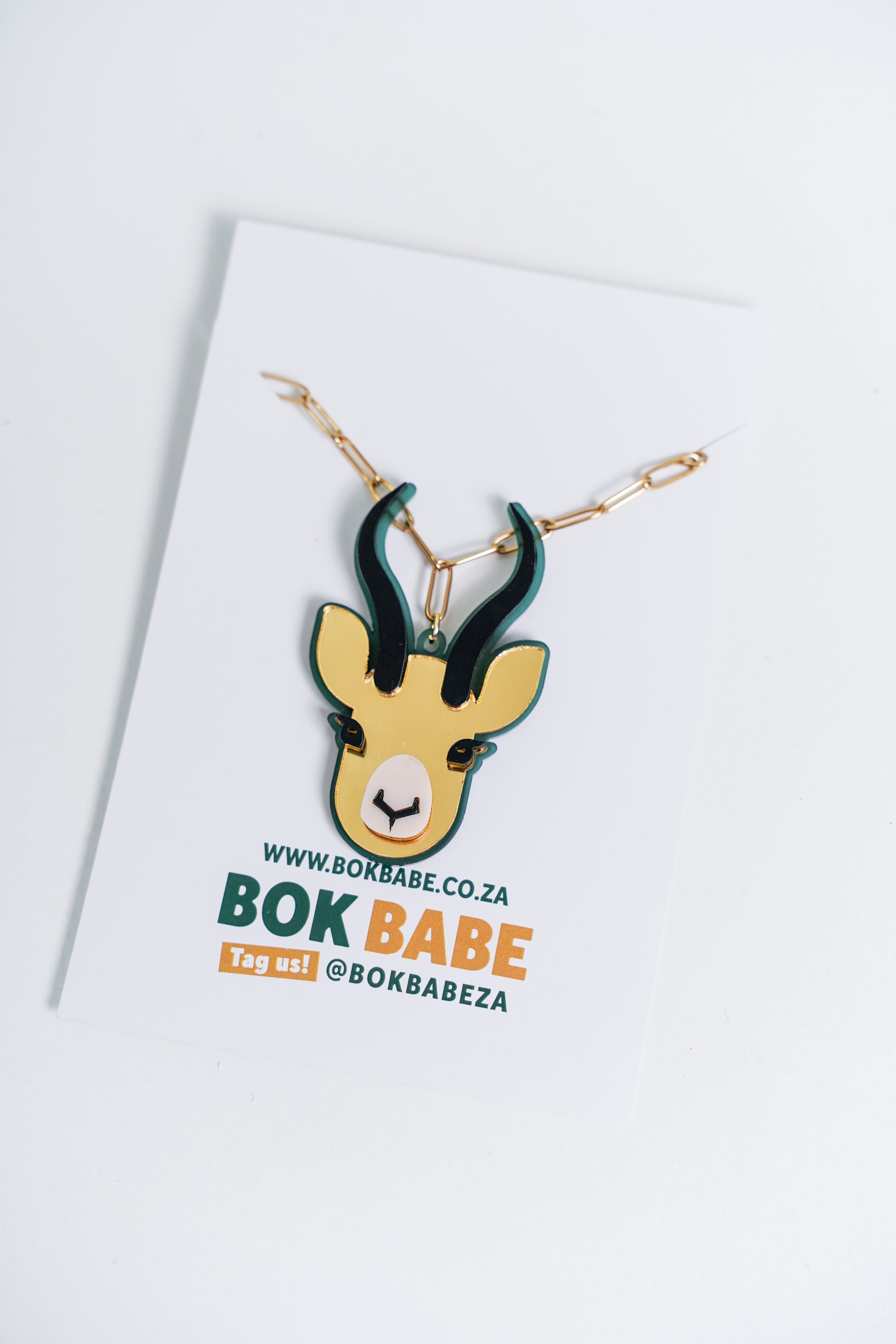 Make a statement with this striking Full Bok Face necklace — a true icon of South African rugby spirit. Crafted from high-quality acrylic and gold-plated chain, it’s lightweight yet eye-catching, perfect for Babes who wear their pride loud and proud.