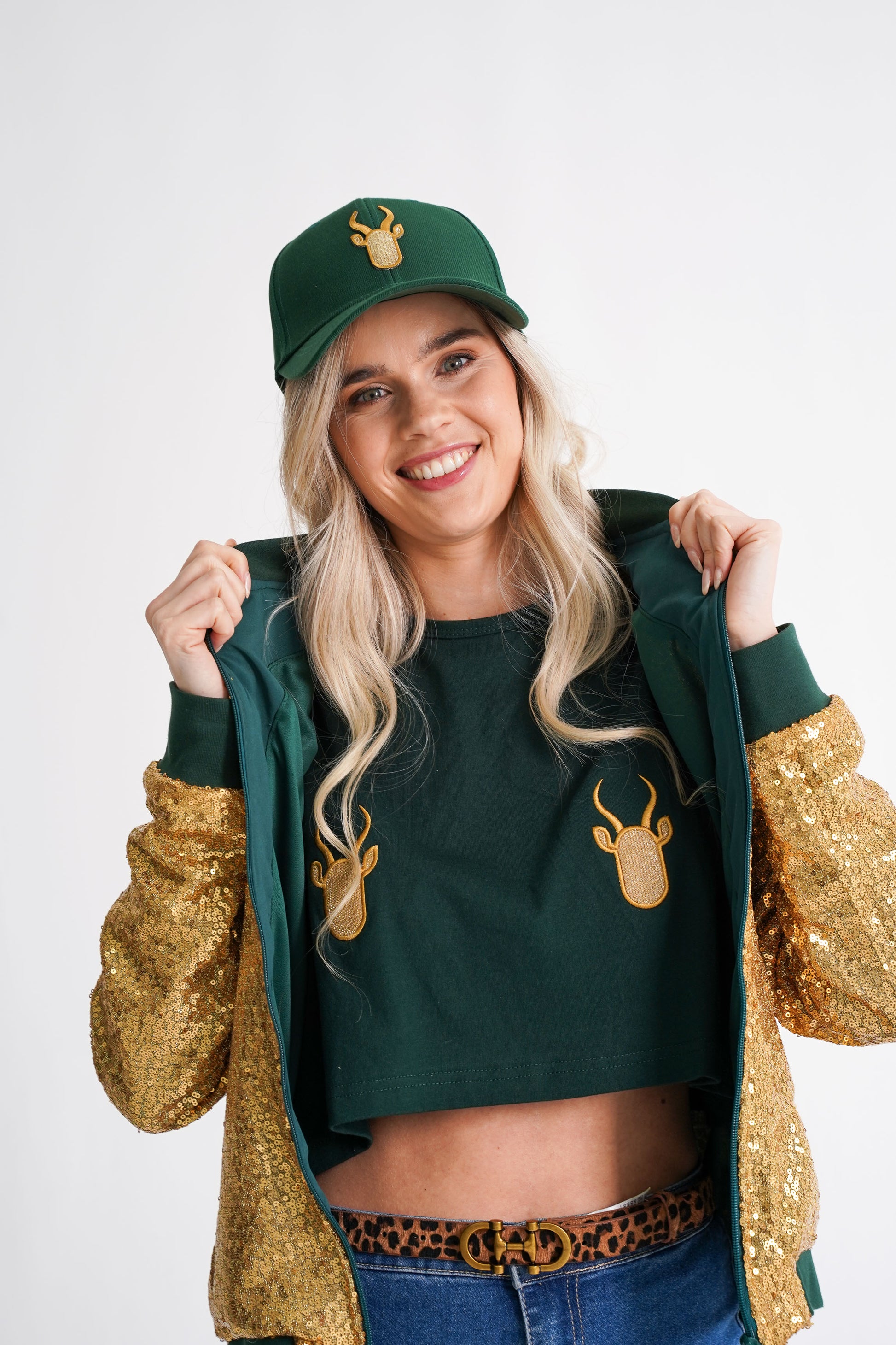 ✔ Bold ‘BOK BABE’ appliqué and embroidery in bottle green lurex on the back — so they see you shine, coming and going